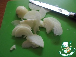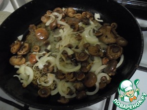 Разогреть оставшееся масло, обжарить на нем лук до румяного цвета, добавить отварные рыжики, обжаривать в течение 7-8 минут. Приправить смесью перцев, мускатным орехом, посолить по вкусу.