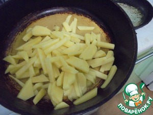 Разогреть 2 ст. л. растительного масла, картофель обжарить на растительном масле до готовности, посолить и поперчить по вкусу.