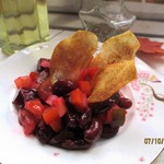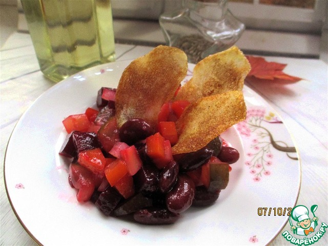 Винегрет с фасолью консервированной, острыми огурцами, маринованным луком и пикантной заправкой. Для подачи сделала домашние чипсы из картофеля с перцем и сушёным укропом.