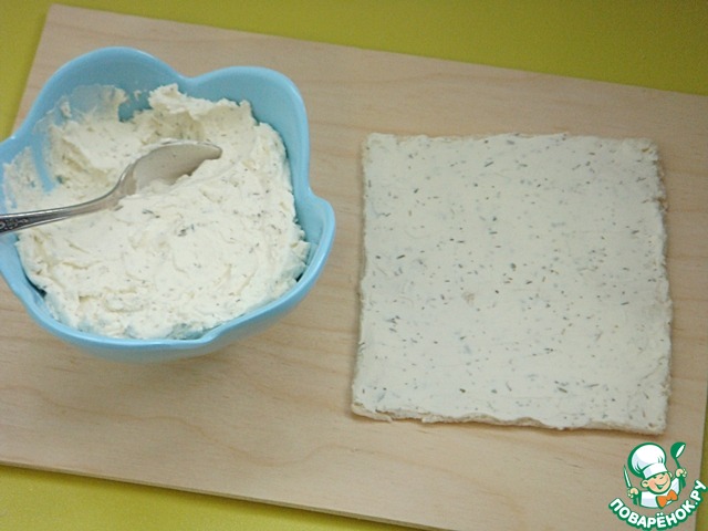 Смешать сливочный сыр, сметану и сушеный укроп. Вполне можно использовать и творожный сыр. Сметану тогда добавлять не нужно.