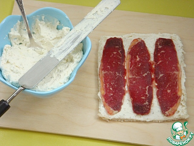 На оставшихся три ломтика хлеба нанесла слой сырной смеси потоньше, по 1,5 ч. л.. Сверху выложила тоненькие ломтики вяленой говядины.