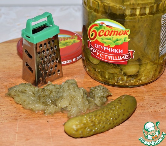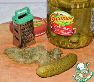 Маринованный огурец (один) натереть на мелкой терке, сок слить.