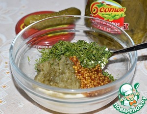 В йогурт (или нежирную сметану) добавить тертый огурец, горчицу и рубленый укроп. Перемешать.