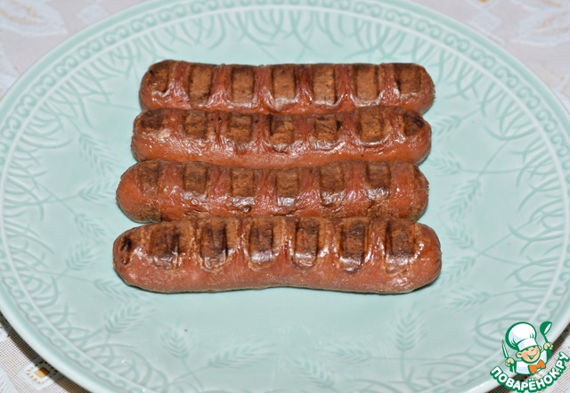 Пока баклажаны остывают, обжарить сосиски на гриле или в сковороде.