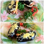 Промазать обе половинки каждого баклажана соусом. -