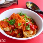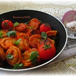 Томаты переложить в сковороду, посыпать специями, заправить соусом Терияки - подрегулируйте его количество под свой вкус. Все перемешать и поварить минут 10.