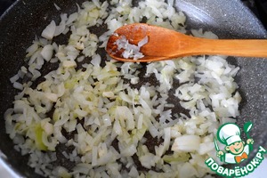 Лук с чесноком мелко режем и обжариваем на сковороде в оливковом масле до прозрачности
