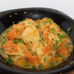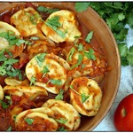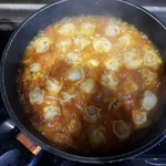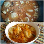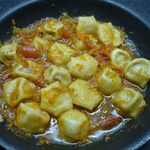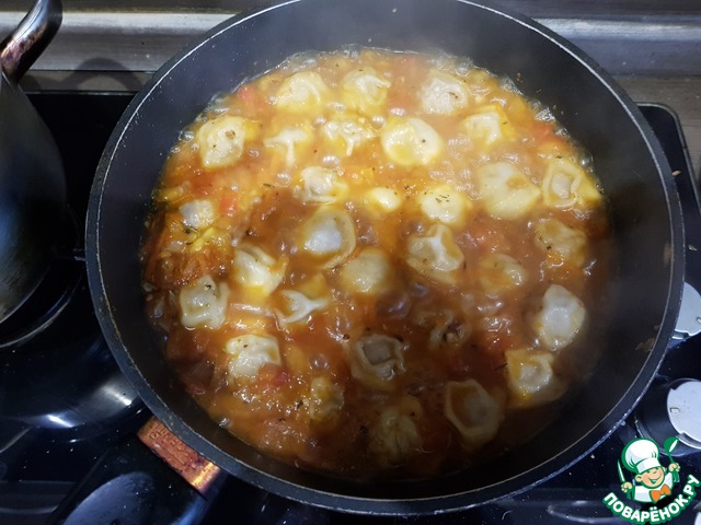 И настала пора наших пельменей - раскладываем прямо замороженные не очень плотно по всему овощному соусу. Заливаем кипятком так, чтобы пельмени были полностью покрыты водой. Накрываем крышкой и тушим 10 минут на среднем огне.