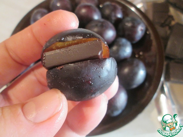 Из каждой сливы аккуратно удалить косточку, стараясь не разъединить половинки, и вложить вовнутрь кусочек шоколада.