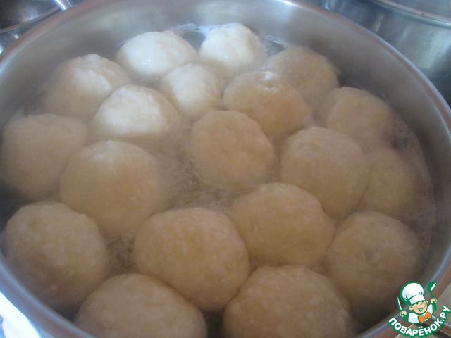В большой кастрюле вскипятить достаточное количество воды, добавить по одной чайной ложке соли и сахара, опустить кнедли в кипяток. Довести до кипения и варить на среднем огне 15 минут. Вынуть шумовкой. Подавать со сметаной или вареньем, а можно и без сопровождения - вкусно в любом случае. В оригинальном рецепте нет разрыхлителя, я бы его добавила ( 1 ч. л. ) - тесто мне показалось жестковатым. Но это дело вкуса.