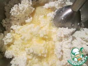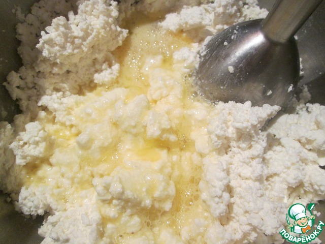 Творог пробить блендером, добавить слегка взбитые вилкой яйца, щепотку соли, размешать.