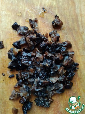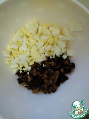 В салатник сложить жареный грибы, яйца, нарезанные произвольно.