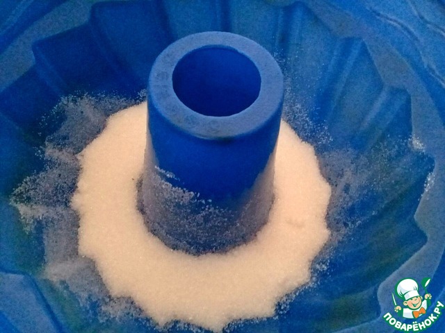 Разогреваем духовку 180*. Насыпаем в форму сахар (4ст. л) и ставим в духовку на 25 минут до образования карамели.