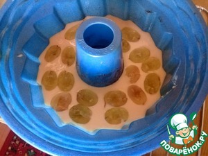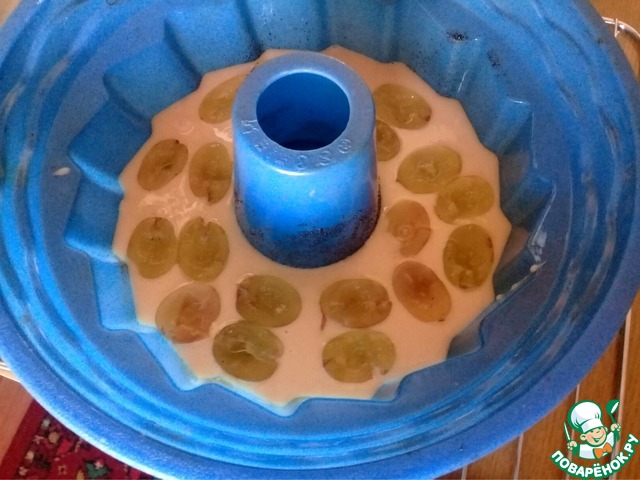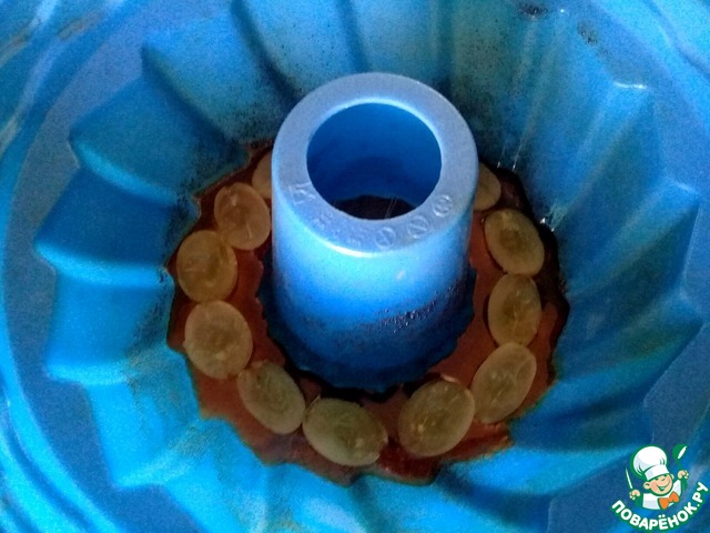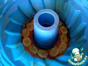 Достаем форму и выгладываем на карамель 1/3 винограда,1/3 заливаем тестом.