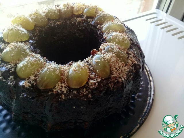 Выпекать 30-35 минут в разогретой духовке при 180*. Готовый кекс остудить, достать из формы. Покрываем шоколадной глазурью и украшаем оставшимся виноградом. Я еще сверху посыпала тертым шоколадом.