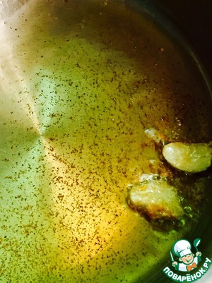 • Масло разогреть в ковшике, добавить в него щепотку красного перца и раздавленный чеснок, прогреть пару минут