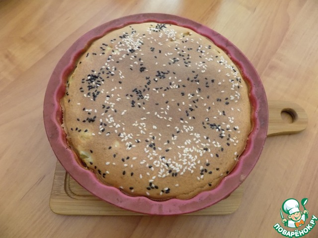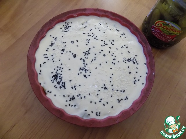 Сверху докладываем оставшееся тесто и разравниваем его лопаточкой. Присыпаем кунжутом чёрным и белым. Если его нет, то это делать не обязательно. Ставим в разогретую духовку до т-180 С на 45 минут. Где-то минут через 20, я накрыла верх фольгой, чтобы он сильно не зарумянился и не подгорел. Ориентируйтесь по своей духовке.