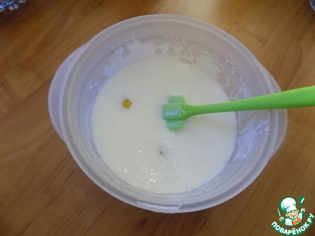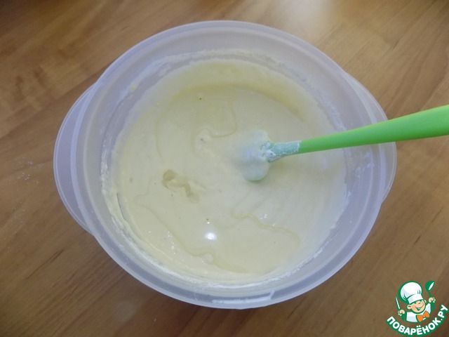 Просеиваем муку и вмешиваем в смесь понемногу. Наливаем масло. Тщательно всё соединяем и тесто наше готово. Тесто по консистенции, как густая сметана.