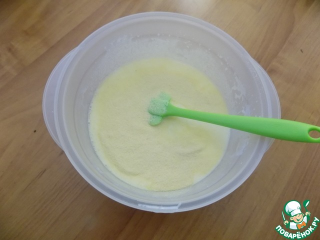 Кладём манку, перемешиваем и даём постоять минут 5, чтобы она разбухла. Я добавила семолину.