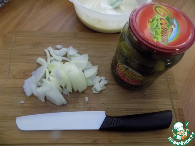 Картофель готов, сливаем с него воду. Отправляем его к огурцам с луком. Перемешиваем и начинка наша готова.