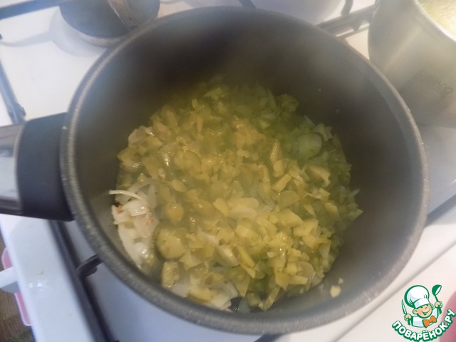 Обжариваем на подсолнечном масле. Режем огурцы мелко и отправляем к луку.