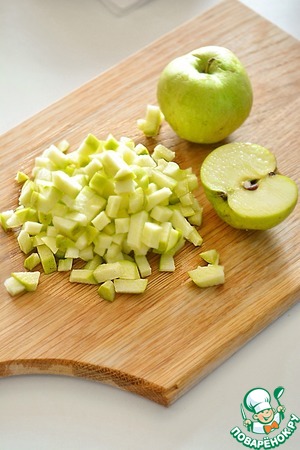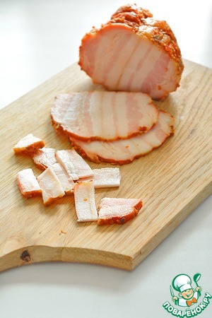 Копченую грудинку нарежьте тонкими ломтиками, а затем квадратиками примерно 1*1 см.