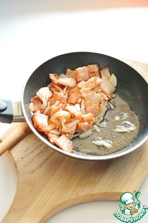 Поджарьте грудинку с луком до золотистого цвета. Наклоните сковороду и слейте лишний жир - он в салате не нужен