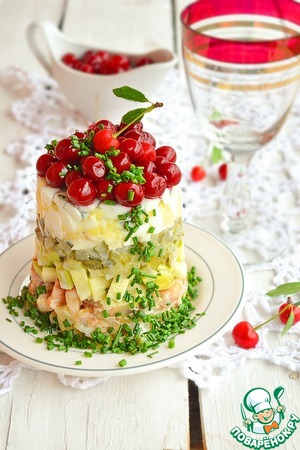 Сверху выложите вишню и посыпьте салат зелёным луком. Дайте настояться в холодильнике пару часов