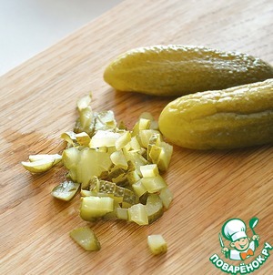 Для салата нужны некрупные маринованные огурцы. Я использовала огурчики хрустящие ТМ "6 соток"