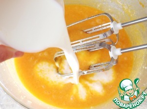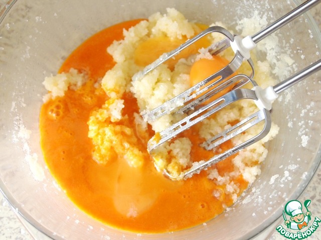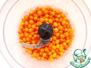 Процедить измельченную облепиху через сито к масляно-сахарной массе и ввести желтки яиц. Перемешать.