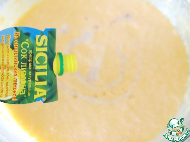 Просеять муку с разрыхлителем, хорошо перемешать, что бы не было комочков. Затем добавить лимонный сок SICILIA. Хорошо перемешать.