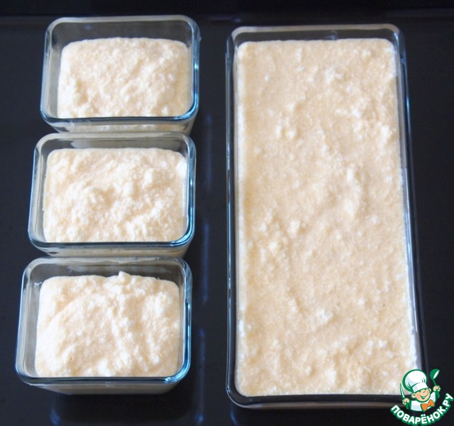 Смазать форму (24х11) и 3 формочки 9х7 см. размягченным сливочным маслом. Выложить тесто в приготовленные формы, поставить в глубокий противень. Залить на треть горячей водой и выпекать 40-50 минут до золотистой корочки, при температуре 180 градусов. Маленькие формочки можно вынуть через 35-40 мин.