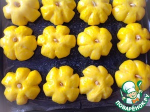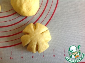Слегка придавить каждый колобок ладонью. С помощью ножа сделать 6-8 разрезов вокруг диска, не доходя до центра 2-3 см, чтобы придать форму тыквы.