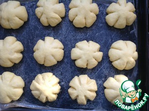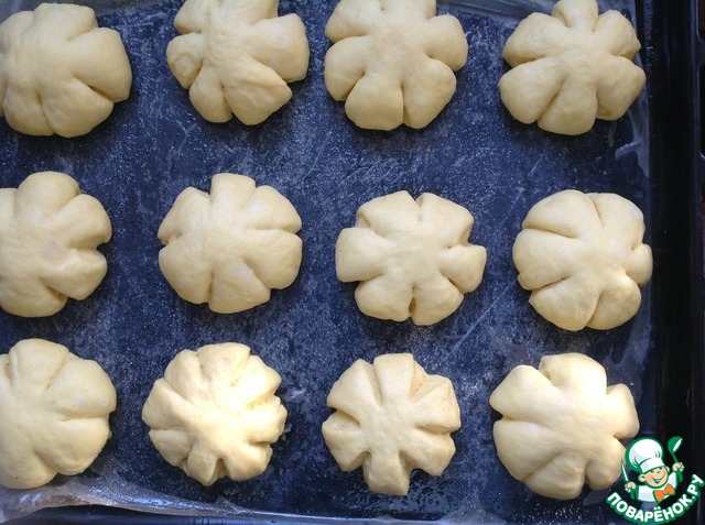 Переложить булочки на противень. Накрыть пленкой и дать булочкам подняться, пока не удвоятся в размере, около 45 минут - до 1 часа.