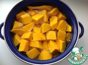 Тыкву поместить в кастрюлю, залить горячей водой, довести до кипения и варить на среднем огне до готовности, примерно 10-12 минут.