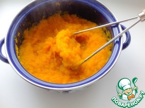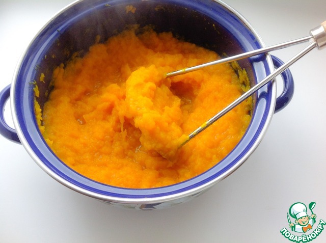 Воду слить и пюрировать тыкву с помощью толкушки или блендера. Остудить.