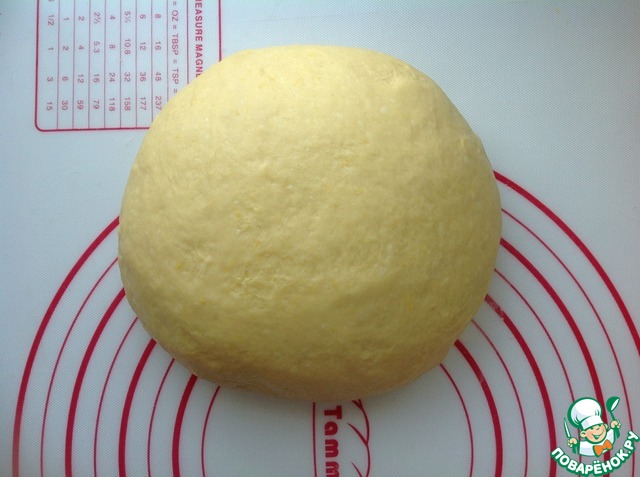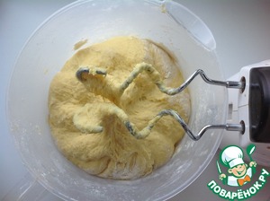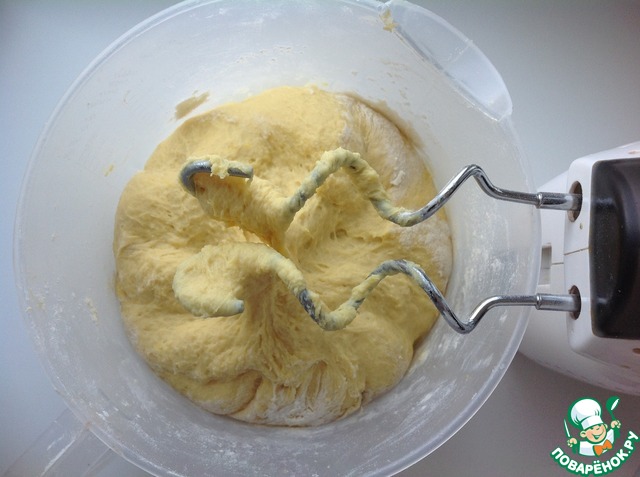 Замесить тесто. Тесто можно замесить при помощи хлебопечки, руками или миксером с насадкой "крюк". Я замешивала с помощью электромиксера с насадкой "крюк". Количество муки может потребоваться больше или меньше, все зависит от ее качества.