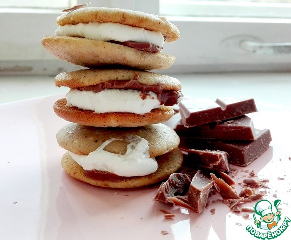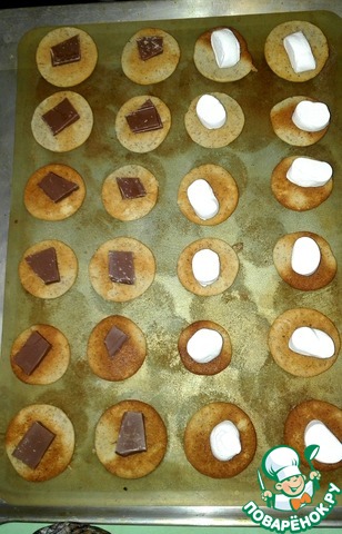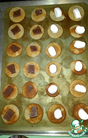 Для этого печенюшки укладываем на противень вверх ногами (духовку пока не выключаем). На одну половину печенья кладём кусочек шоколада, на вторую-маршмеллоу. Отправляем все это в духовку на 1-2 минуты, чтобы шоколад немного растаял, а зефир разбух. -