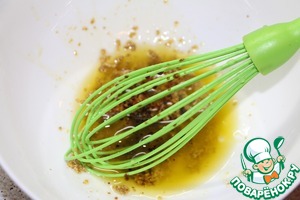 Для заправки смешать растительное масло с горчицей, лимонным соком, соевым соусом, взбить венчиком, отрегулировать вкус сахаром (я использую мед)