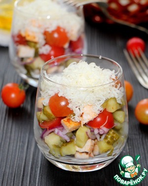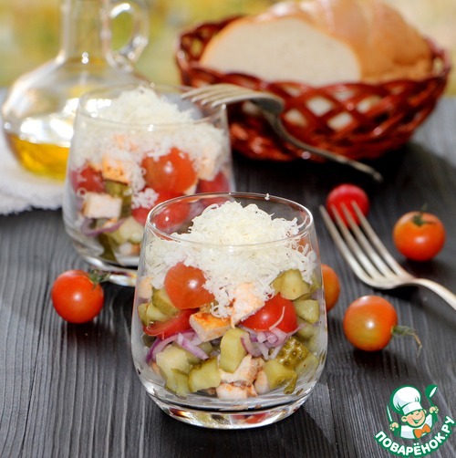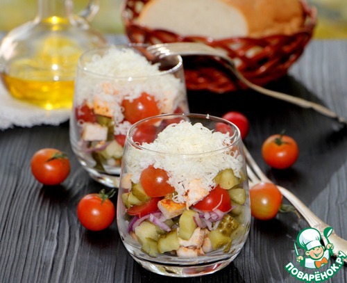 Знакомое сочетание овощей, знакомая заправка. Частенько готовлю этот салат именно в порционной подаче.