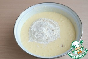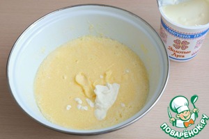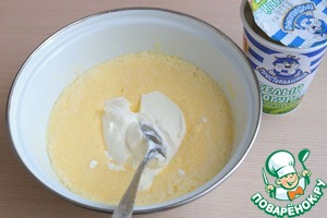 Смесь растереть до консистенции сметаны. К яично-масляной смеси добавить соду (1 ч. ложка), гашеную лимонным соком (3 ст. ложки).