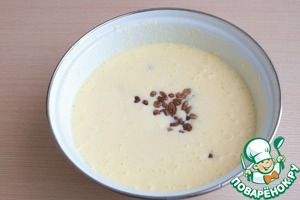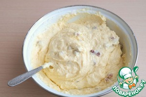 Изюм замочить в холодной воде на 2-3 часа, затем промыть. Подготовленный изюм добавить в смесь.