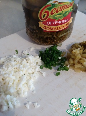 В соус вводим огурцы, белок и лук. Перемешиваем и подаем.