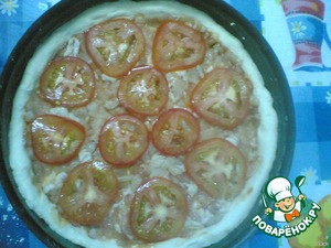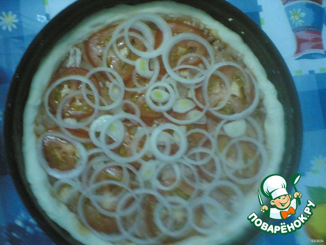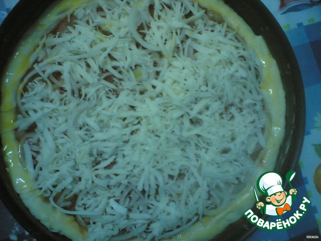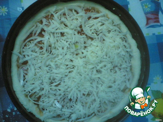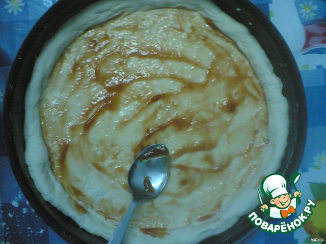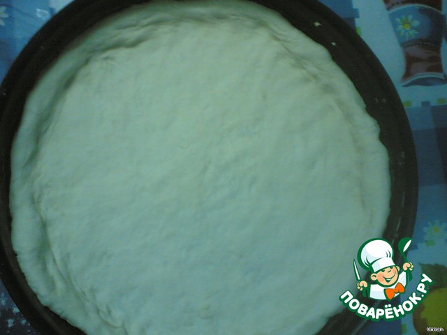• Дрожжевое тесто раскатать и выложить в круглую форму или сковороду, сформировав по краям небольшие бортики.
