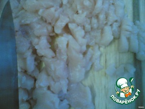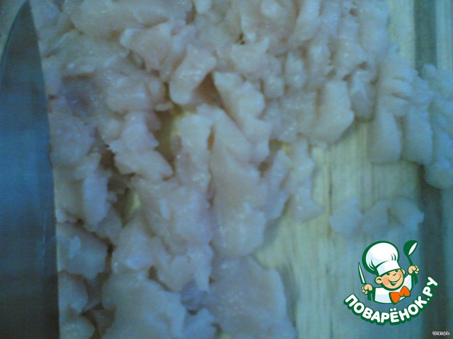 • Мелкими кубиками нарезать куриное филе. Посолить, добавить специи по вкусу, хорошо перемешать.