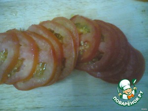 • Томаты (помидоры), нарезаные кружками, аккуратно выложить по кругу.