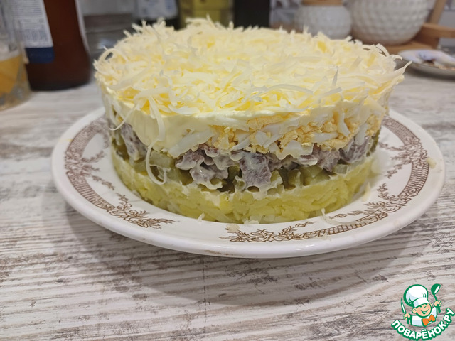 Очень вкусный, сытный салат с мясом. Салат простой, из минимума компонентов, но они настолько "дружат" друг с другом, что оторваться невозможно! Угощайтесь!