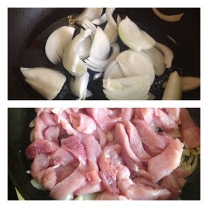 Лук нарезать полу кольцами и поставить обжаривать на растительном масле до мягкости. Затем не убавляя огонь, добавить мясо нарезанное тонкими длинными полосками. Перемешать, и жарить до легкого зарумянивания мяса.