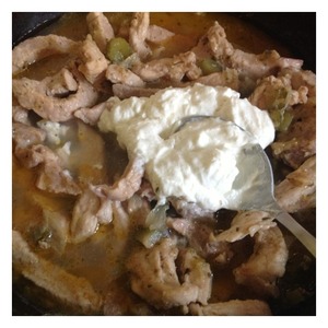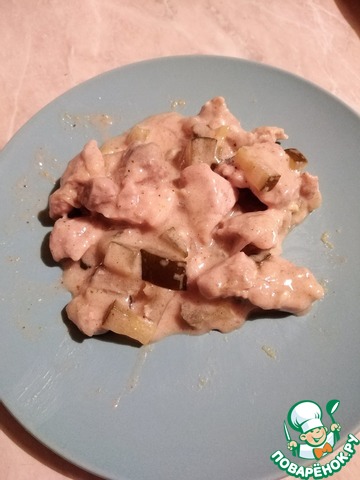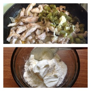 Через 20-30 минут добавить к мясу нарезанные кубиком маринованные огурчики и чеснок пропущенный через пресс. В холодную сметану добавить муку, хорошо перемешать.