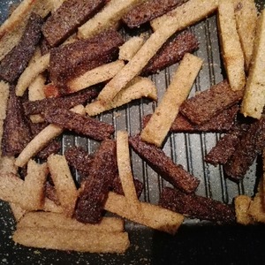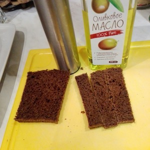 режем на гренки и слегка смазываем оливковым маслом с обеих сторон, после чего отправляем на сковородку, на небольшой огонек -